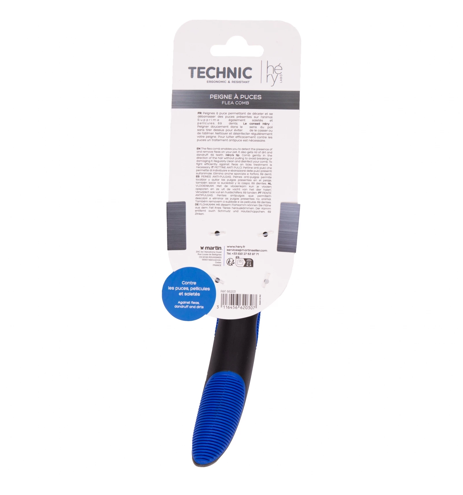 Pour enlever les puces du poil de votre chien, Héry vous propose son peigne à puces. Équipé de 54 dents, il vous permettra de déceler et de débarrasser votre animal de ces parasites. Ses dents resserrées vous permettront de repérer rapidement les puces et les autres parasites afin de pouvoir les retirer.