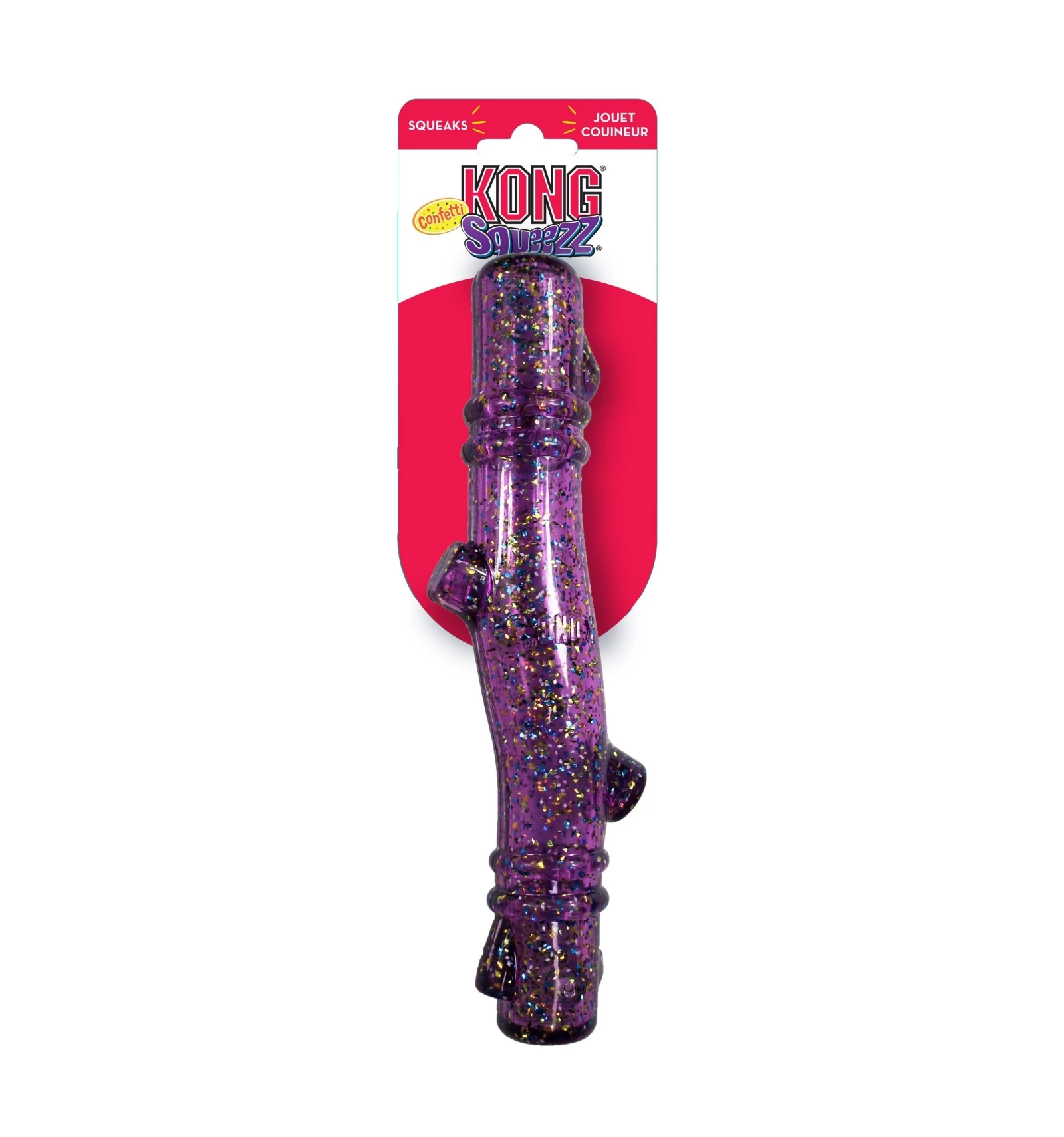 Nouveau jouet KONG en caoutchouc durable et pailletée pour de longues sessions de jeu. Il contient un squeaker qui éveillera même les chiens les moins actifs.