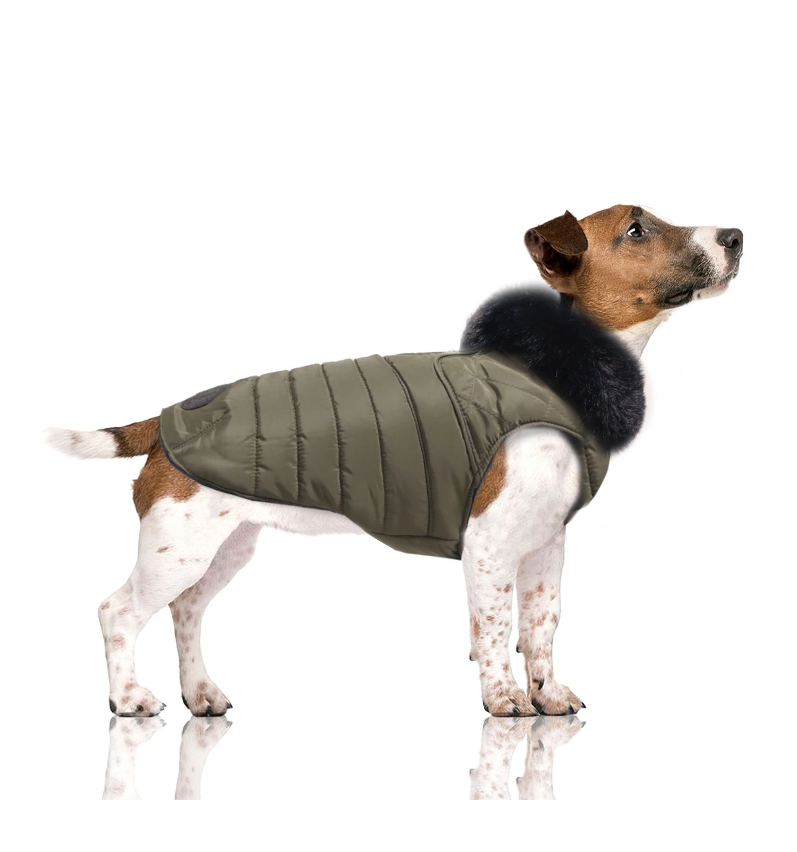 La doublure et le col sont en imitation de fourrure noire pour que votre chien soit élégant en toute circonstance.